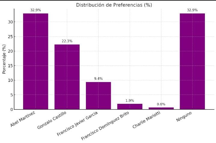 Los resultados arrojaron un empate entre Abel Martínez y la opción “ninguno”, ambos con un 32.9%. En tercer lugar se ubicó Gonzalo Castillo con un 22.3%, seguido de Francisco Javier García con un 9.4%. Más atrás quedaron Francisco Domínguez Brito con 1.9% y Charlie Mariotti con 0.6%.