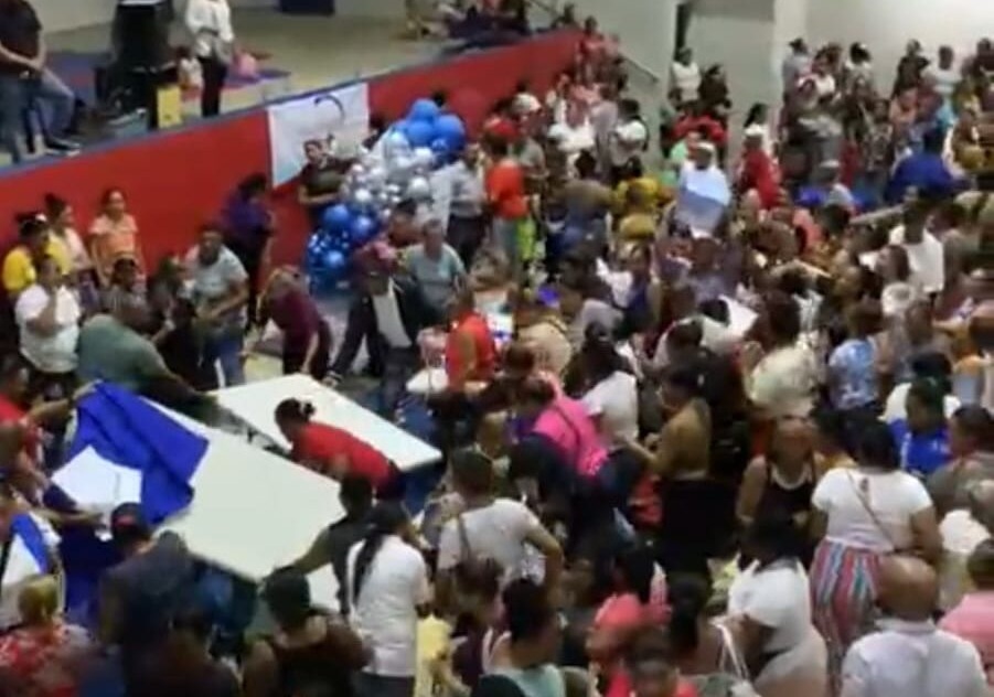 Decenas de personas comenzaron a empujarse, gritar y disputar los obsequios, provocando desorden y tensión en el lugar.